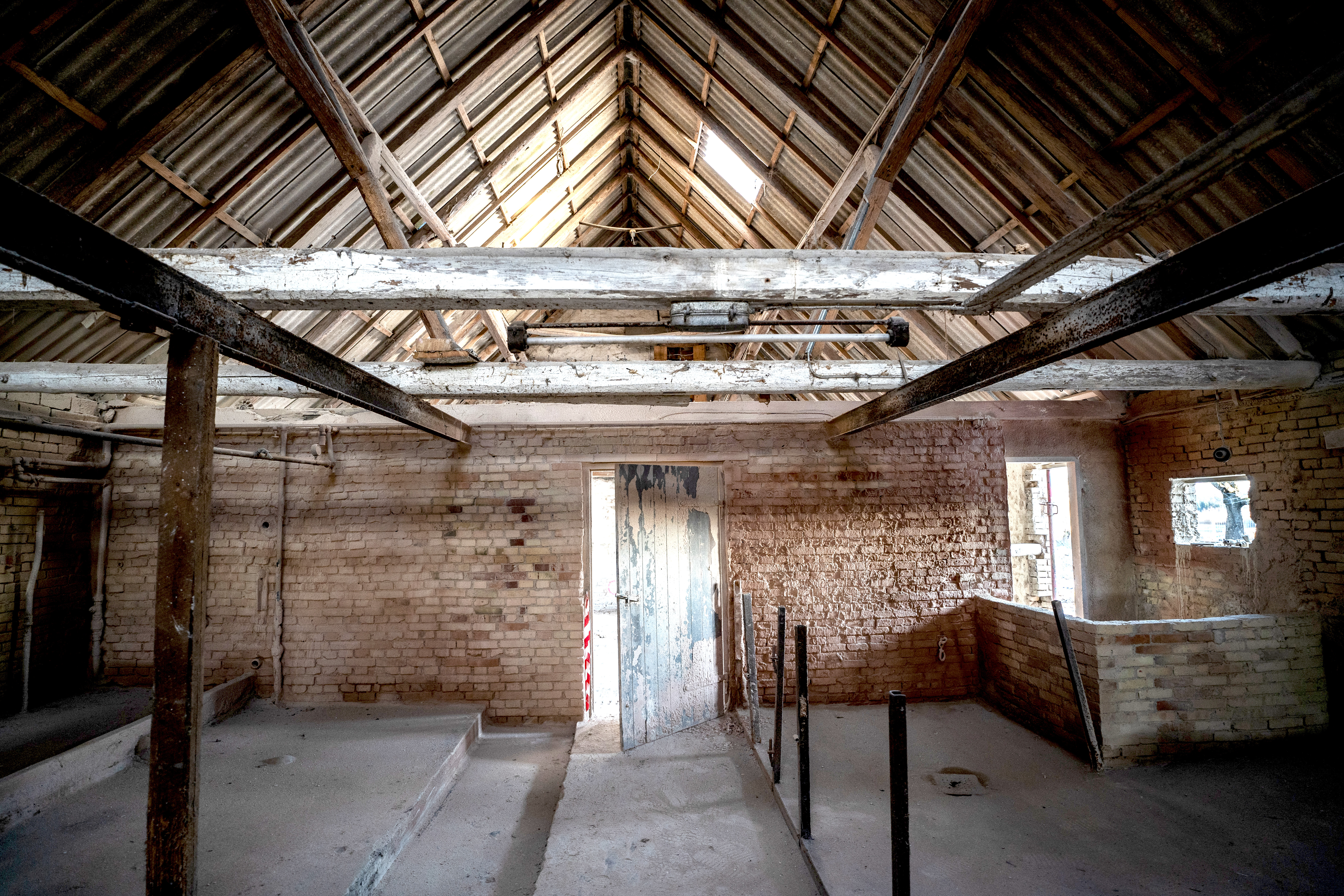 The existing brick walls, both indoors and outdoors, have been sandblasted, revealing beautiful details where a mix of yellow and red bricks, as well as white sand-limestone, has emerged.