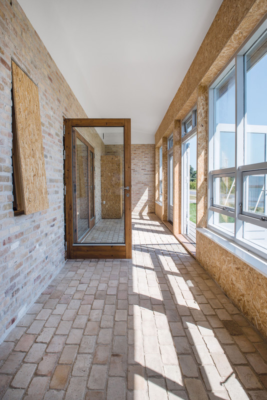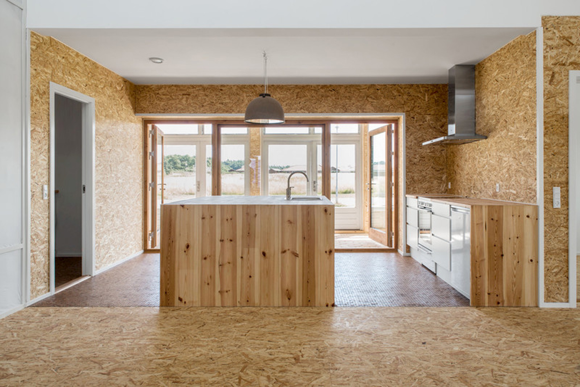 Inside, OSB panels from surplus wood, cork flooring from champagne cork waste, and tiles made of recycled glass create a warm, contemporary aesthetic. Insulation from paper wool and granulated styrofoam further reduces environmental impact.